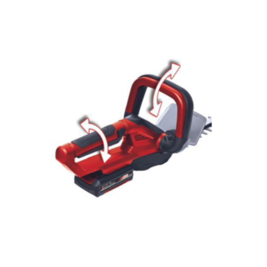 - Prednja ručka je podesiva, dok se zadnja ručka može okretati za dobro rukovanje i optimalno prilagođavanje makaza za živu ogradu svakoj radnoj situaciji.