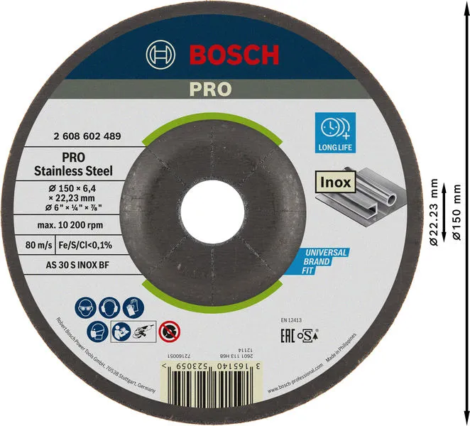 PRO Stainless Steel brusni disk 150×6×22,23 mm je profesionalni Bosch alat namenjen za zahtevne radove u građevinarstvu, instalacijama i montaži.