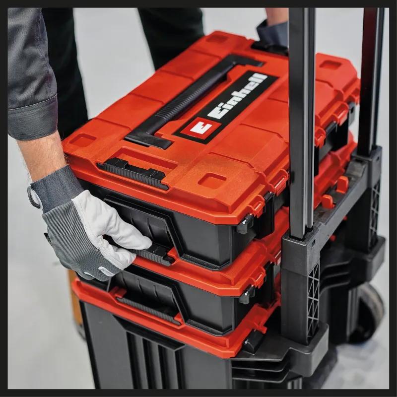 Einhell E-Case L je član modularnog E-Case sistema kompanije Einhell koji se izdvaja po skladištenju i transportu mašina i alata. Praktičan sistem zaključavanja za spajanje naslaganih kofera obezbeđuje sistematičan i siguran red tokom transporta. Kućište je napravljeno od polipropilena i stoga ima visoku krutost, otpornost na toplotu i otpornost na udarce. Stabilna konstrukcija omogućava ukupnu nosivost do 120 kg. Mašine i alati se mogu lako transportovati zahvaljujući teleskopskoj i izuzetno širokoj ručki. Veliki točkovi pružaju prijatne karakteristike vožnje po bilo kojoj površini. Zahvaljujući svom inteligentnom dizajnu, kućište je otporno na prskanje vodom i može se transportovati po bilo kom vremenu. Teleskopska i ergonomska ručka obezbeđuje optimalnu udobnost nošenja, na primer kada je vadite iz prtljažnika automobila. E-Case L može biti opremljen katancem za osiguranje od krađe njegovog sadržaja. Kupovinom takođe dobijate uklonjivu policu za ručne alate i nalepnice koje Vam mogu pomoći prilikom identifikacije sadržaja.